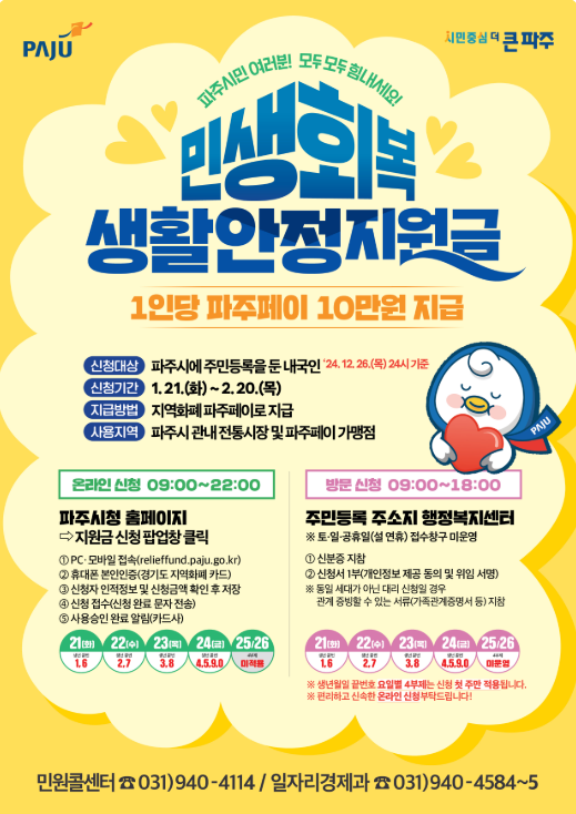 지원금을 받기 위해서는 정책 요건을 충족하고, 적시에 신청서를 제출하는 것이 중요합니다. 파주시는 이 지원금을 통해 지역 주민들의 생계를 안정화하는 데 주력하고 있습니다.